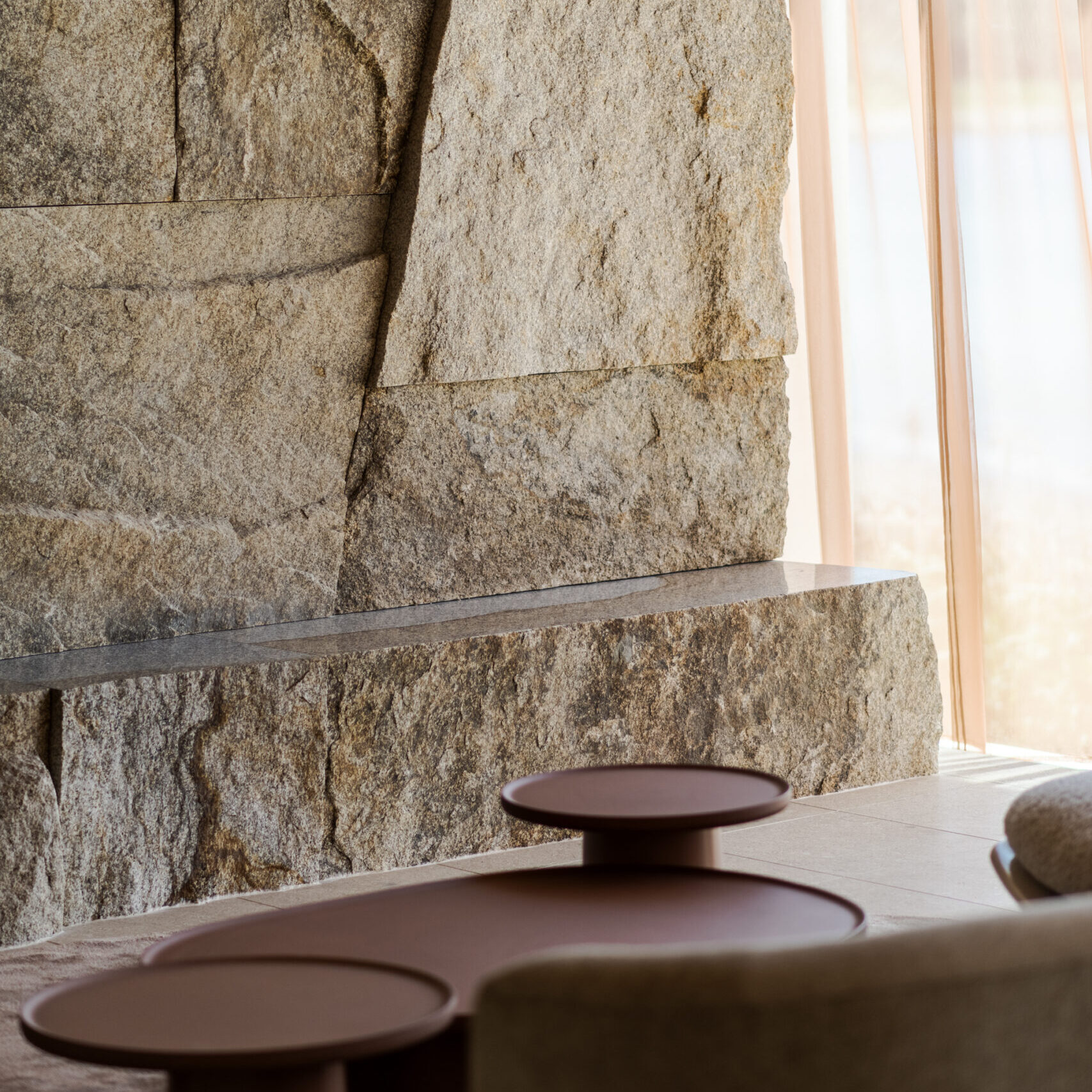 暖炉壁、コンソールやコーヒーテーブル、室内景石は、屋外と同様に岐阜県の木曽石や瀬戸内の島から切り出した自然石を使用。炎の揺らぎと石肌の陰影が呼応し、時間とともに変化する豊かな質感が、住まいにあたたかみと静けさを添える。